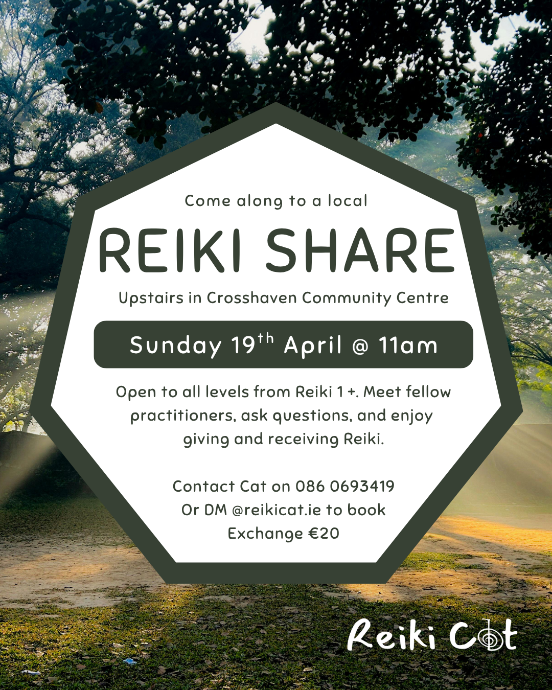 Join me for a local Reiki Share, upstairs in Crosshaven Community Centre on Sunday 19th April at 11am.